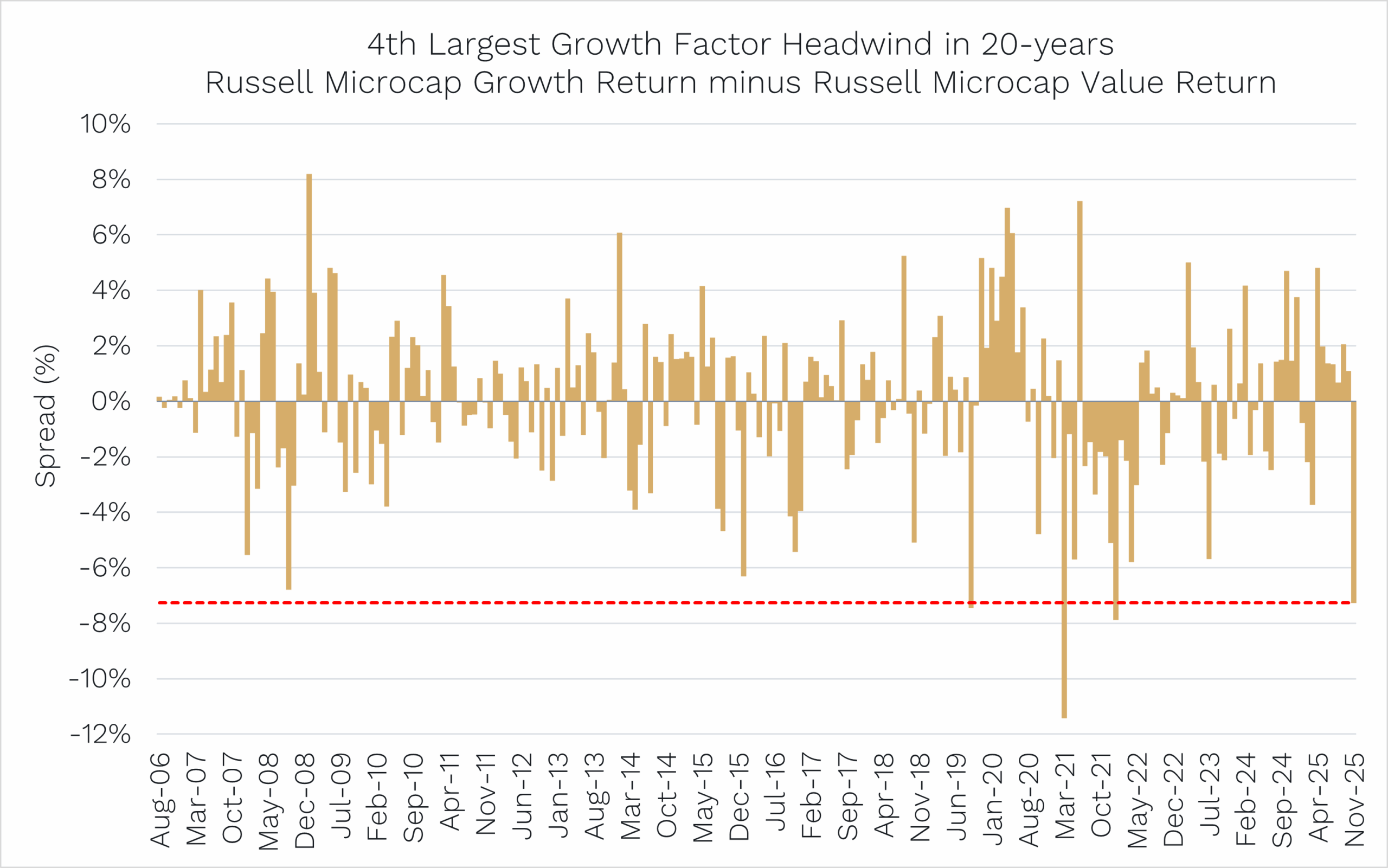 While we don’t really fish as low down the market capitalisation spectrum as microcaps, it shows that growth-oriented microcaps underperformed their value counterpart in November by the fourth most of any month in the last 20 years!