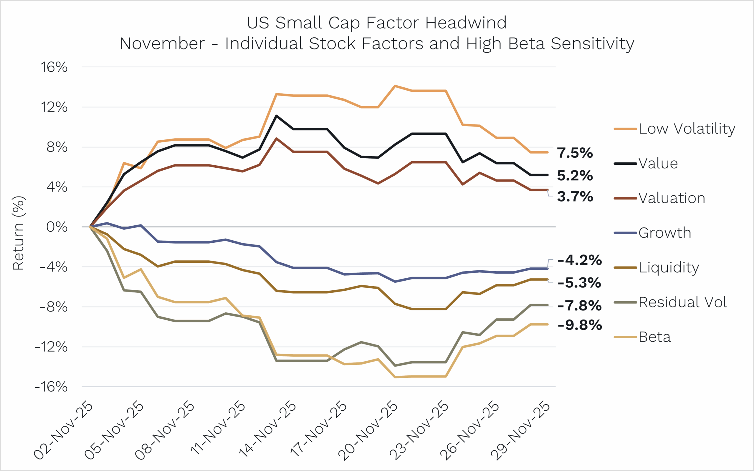 Source: Bloomberg for the Russell 2000 index long-short factors. Data as of 30 November 2025.