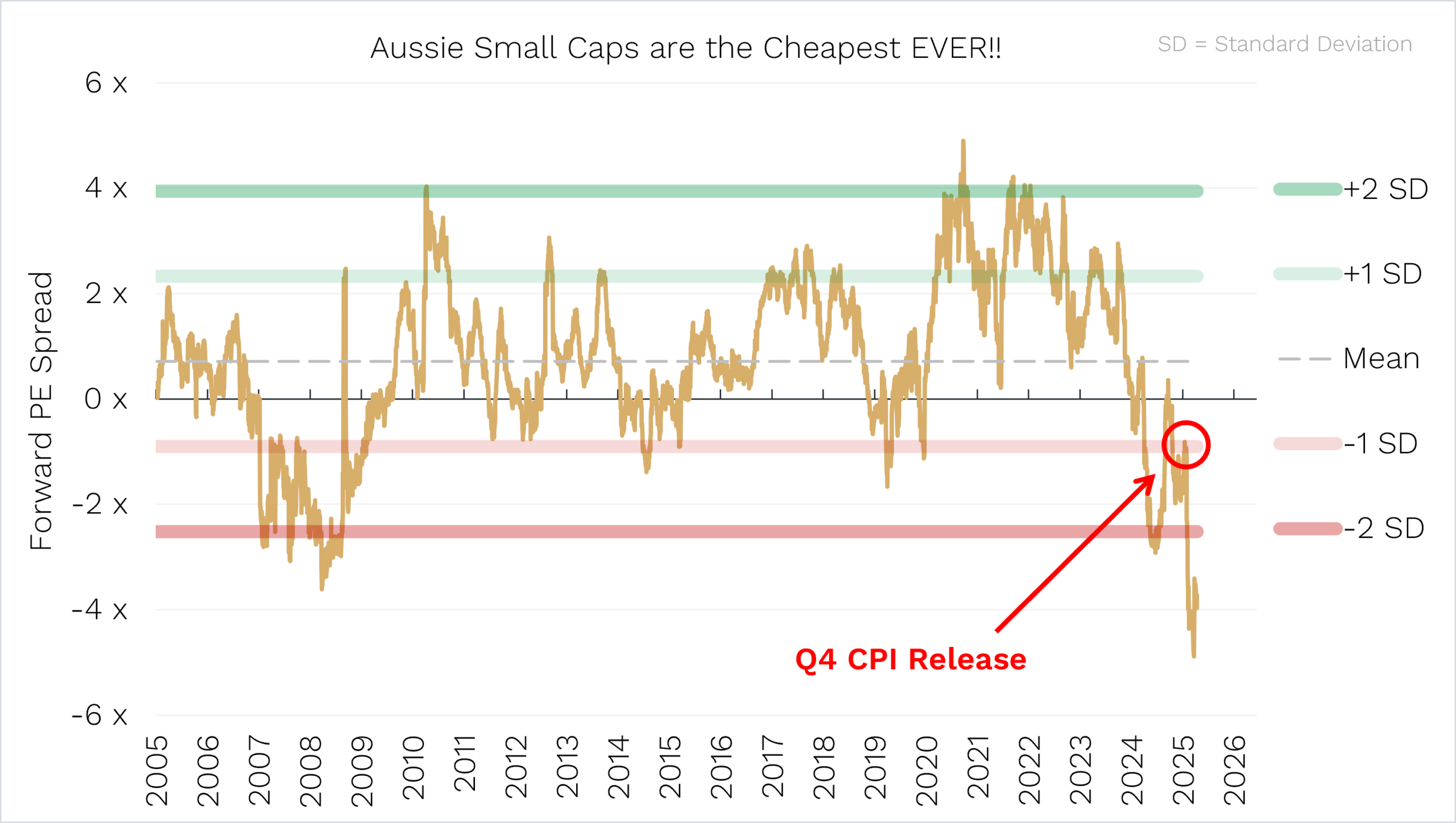 With Aussie small-cap valuations at 13.9x, they are now only marginally above the 13x they bottomed at after the 2022 sell-off, and the 12x they bottomed at in COVID.