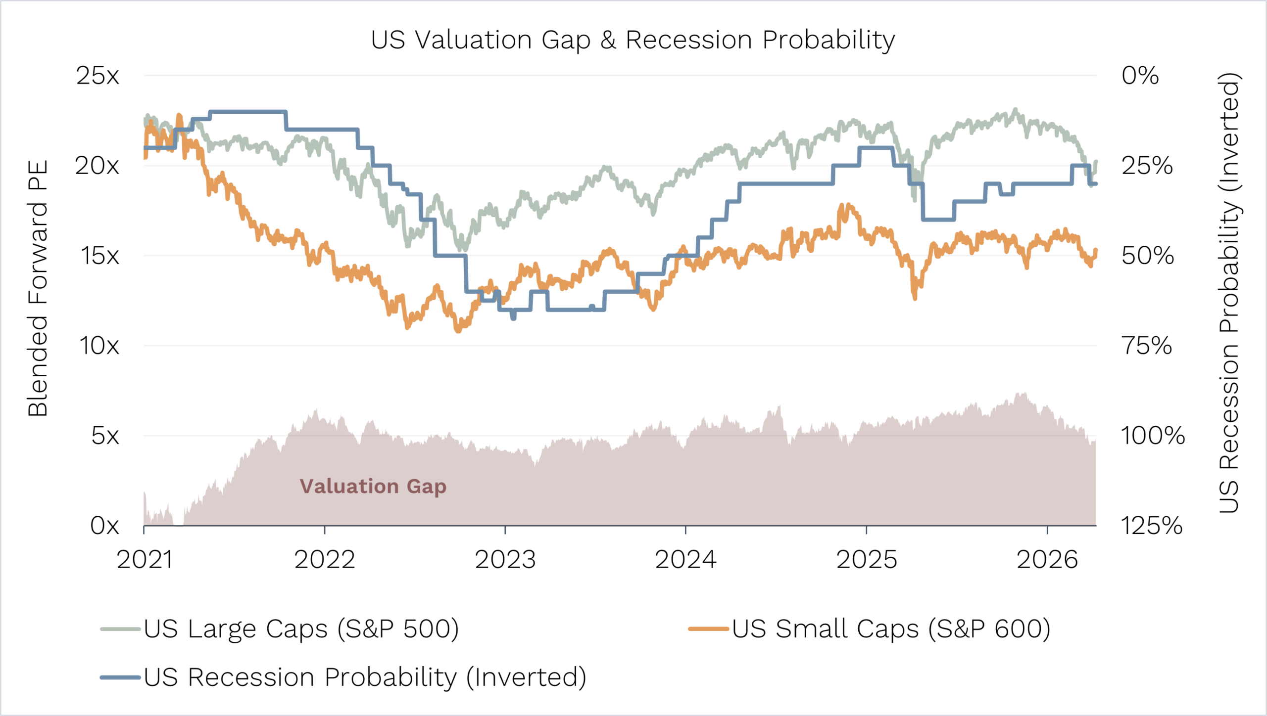 Already sensing that rates would rise during the COVID recovery, equity markets had begun selling off in 2021, but the falls continued in 2022 on the back of the oil spike. You can see this for both US large caps (green line) and small caps (orange line) in the chart below, where we highlight the fall in their P/E ratios.